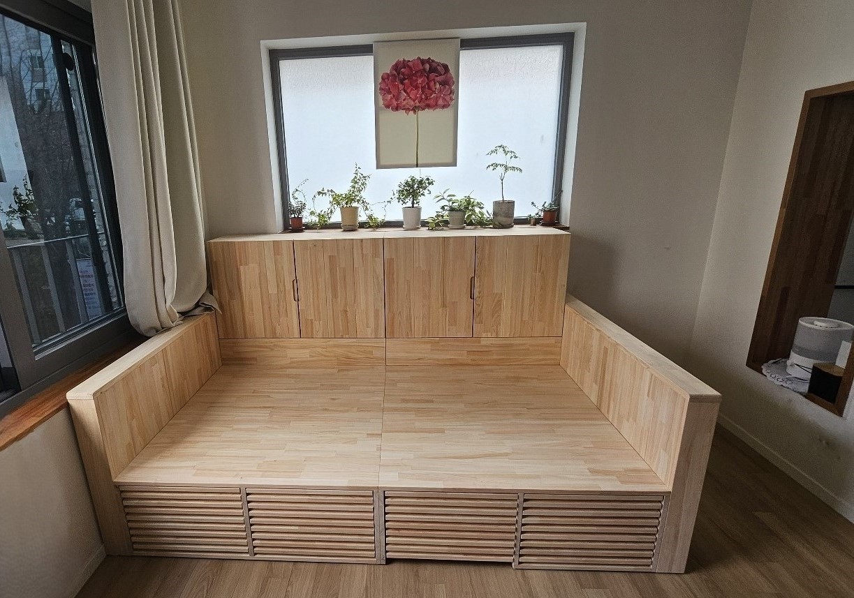 배**고객님 댁은 창이 예쁜 단독 주택이셔서 창을 가리는 책장 부분은 빼고, 창 높이에 맞춰 등받이 수납장은 그대로 넣어 수납 공간을 만들어 드렸네요.